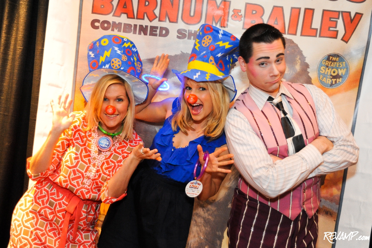 Monumental Sports' LaRhonda Lombardi and Availor Philanthropy's Katherine Kennedy clown around with performer Dustin Portello.